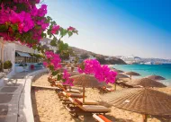 Experience the pure leisure of Mykonos. Swim, relax and sunbathe on comfortable sun beds beneath the shade of umbrellas while relishing a snack and a cold beverage.